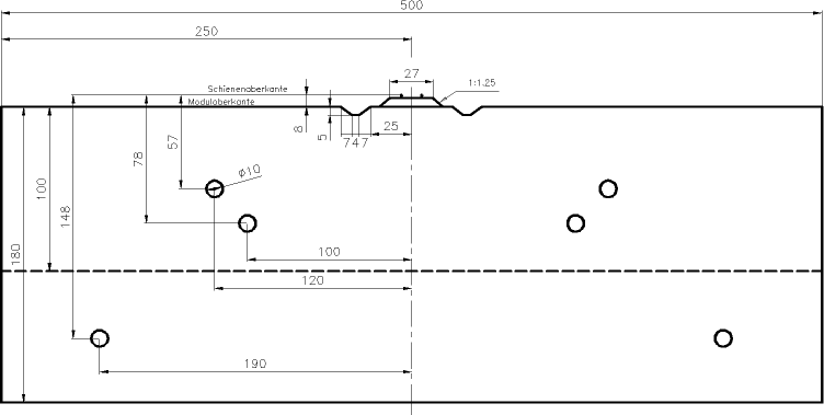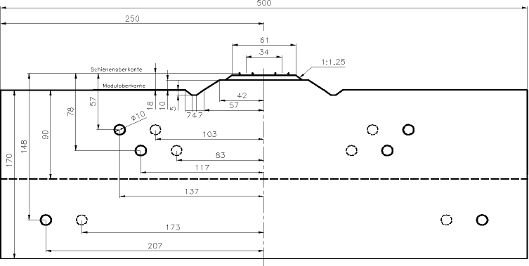 Bei mehrgleisigen Modulen sollten alle Bohrungen für jedes Gleis vorhanden sein. Dadurch wird eine freizügige Verbindung von Modulen mit unterschiedlicher Gleiszahl ermöglicht. Abweichend davon ist es zulässig, bei mehrgleisigen Modulübergängen die inneren Bohrungen ganz oder teilweise wegzulassen.